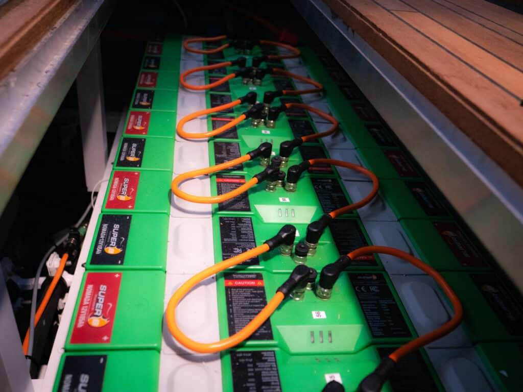 On board, we added a 2.8 kW bidirectional DC-DC converter. This allows the propulsion batteries to charge the service bank and vice versa. In pratique, this means you can run all onboard systems, from cooking to navigation electronics, directly from the propulsion pack when needed. Or, when docked, you can use your standard shore charger to top up both propulsion and service systems seamlessly.