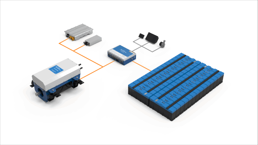 At the core of the propulsion system is the Power Distribution Unit (PDU), the central management hub of the drivetrain. It makes high-voltage operation safe and reliable by combining essential functions such as insulation monitoring, fuses, precharge circuits, and safety relays. The PDU also integrates a battery management system and uses HVIL (High Voltage Interlock Loop) connectors.
